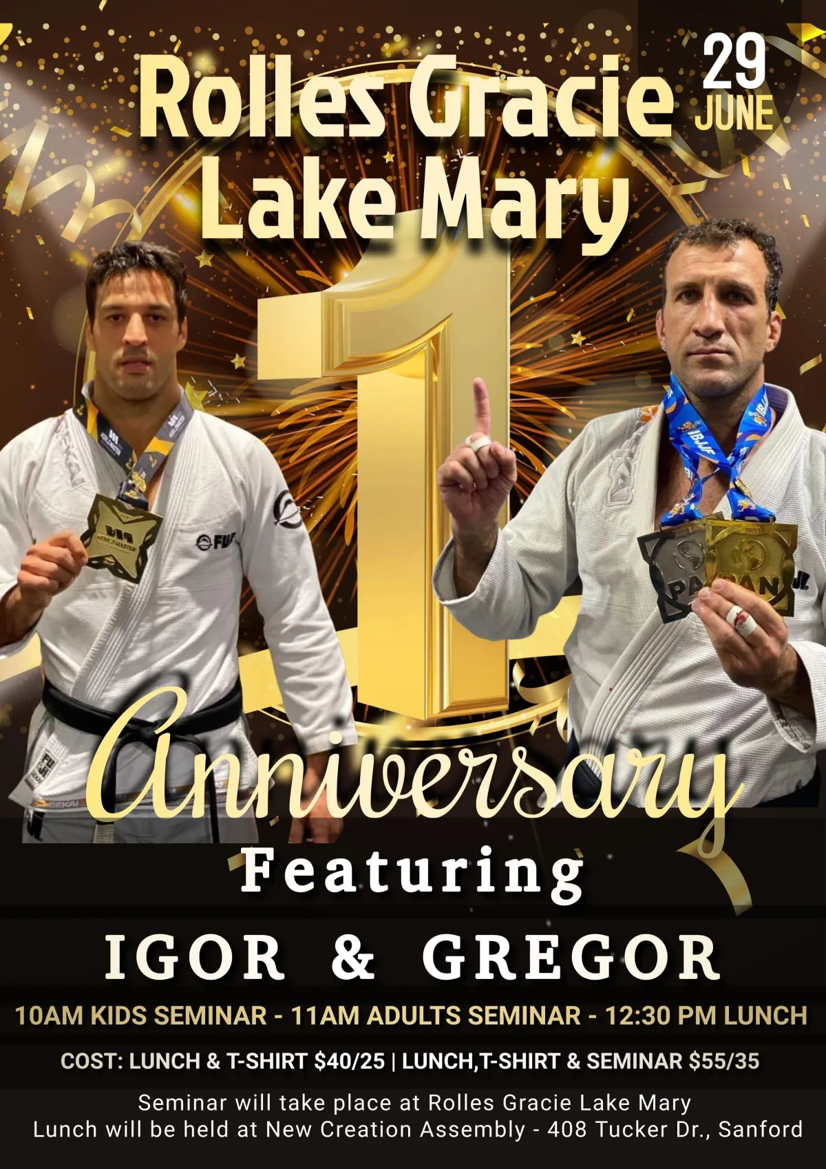 Join us on June 29th as we celebrate a year of growth, achievements, and community at Rolles Gracie Lake Mary.